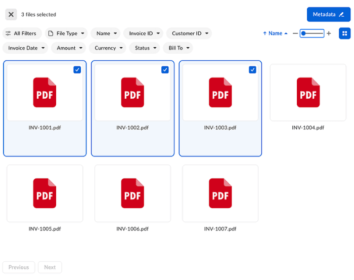 is a ground-up redesign of the original metadata view of the Box Content Explorer UI element. It introduces a streamlined interface tailored for metadata-driven workflows. Key features include filtering and editing interfaces with dedicated UI for each metadata field type, flexible display options with list and grid views, pagination support, and more.