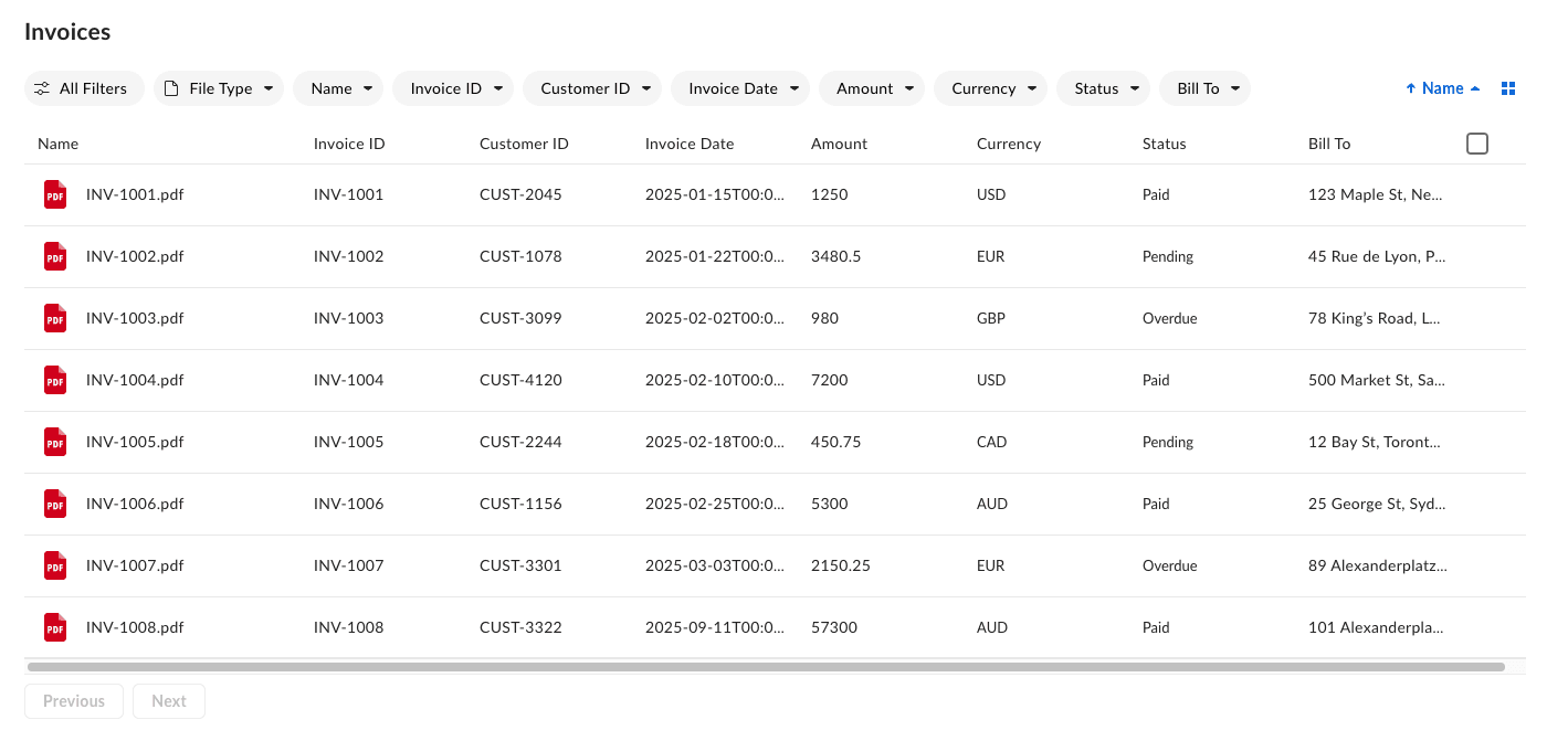 . - Action bar – Contains filter chips for each metadata field, sort options, and the view mode toggle button (list or grid).